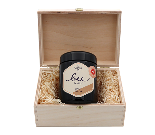 m Honigsolo «Schweizer Waldaroma» präsentieren wir unseren feinen Schweizer Waldhonig im 350g Miron Aromaglas in unserer attraktiven Bee-Family Echtholzbox. Unser Schweizer Waldhonig ist zähfliessend, dunkel und meist leicht bernsteinfarben. Er schmeckt klassisch holzig, ist nach frischer Rinde riechend, leicht karamellig und von feiner Konsistenz. Dieser Edelhonig ist butterzart-schmelzend, zergeht auf der Zunge und fasziniert mit einer weichen Süsse. Er präsentiert sich wild und unbändig, mit sehr edlen Zügen und mundet im Abgang kurz und knackig nach süssem Malz und frischer Feige. Weitere Attribute sind: Karamell, moosige Noten mit einem ausgewogenen Aroma frischer Tannennadeln.